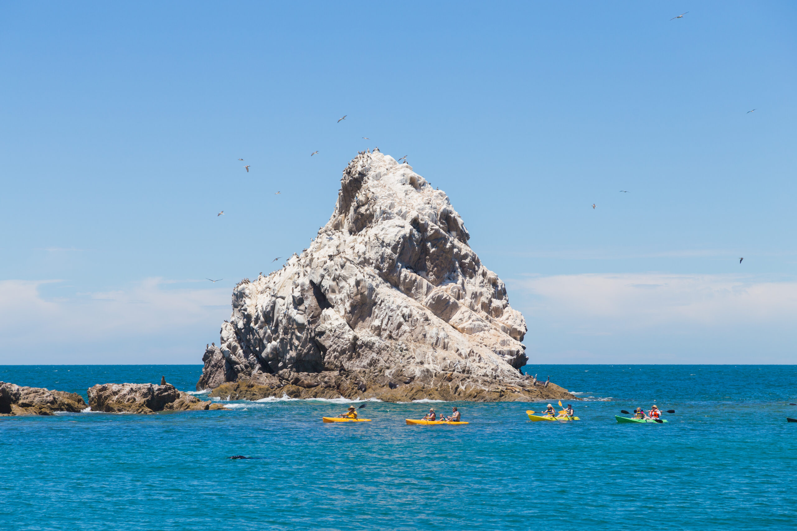 También conocida como “Isla de los Lobos”, Isla San Jorge es hogar de una de las colonias más grandes de lobos marinos en el Golfo de California. Desde el momento en que te acercas en bote, el sonido de estos juguetones habitantes te da la bienvenida. Algunos se asolean en las rocas, mientras que otros nadan curiosos alrededor de las embarcaciones.